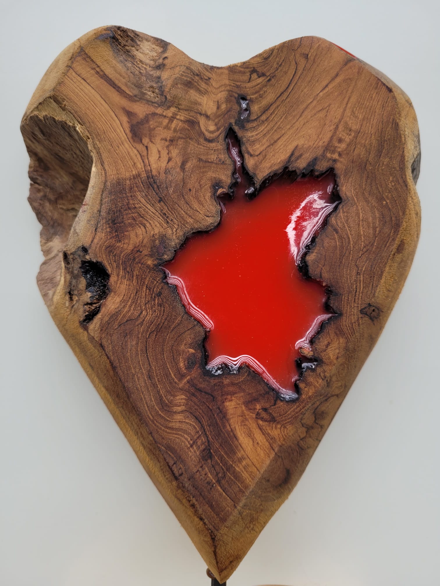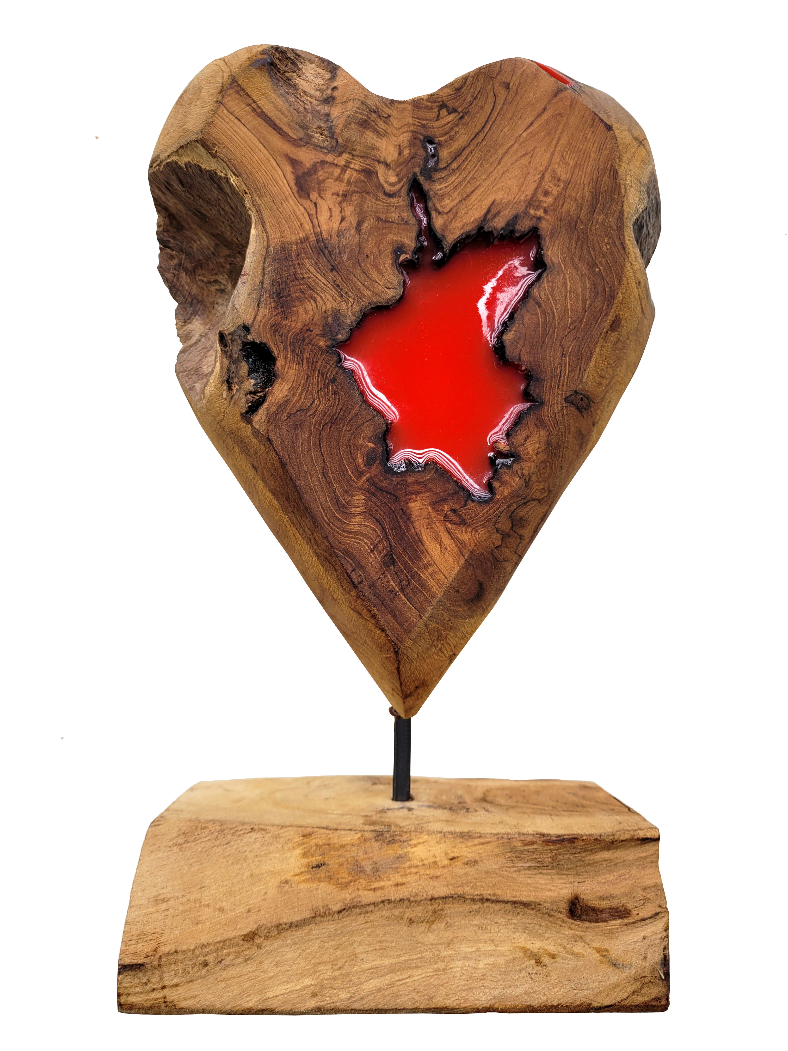 Ručně vyrobená dekorace srdce - teakové dřevo v kombinaci s červenou pryskyřicí.