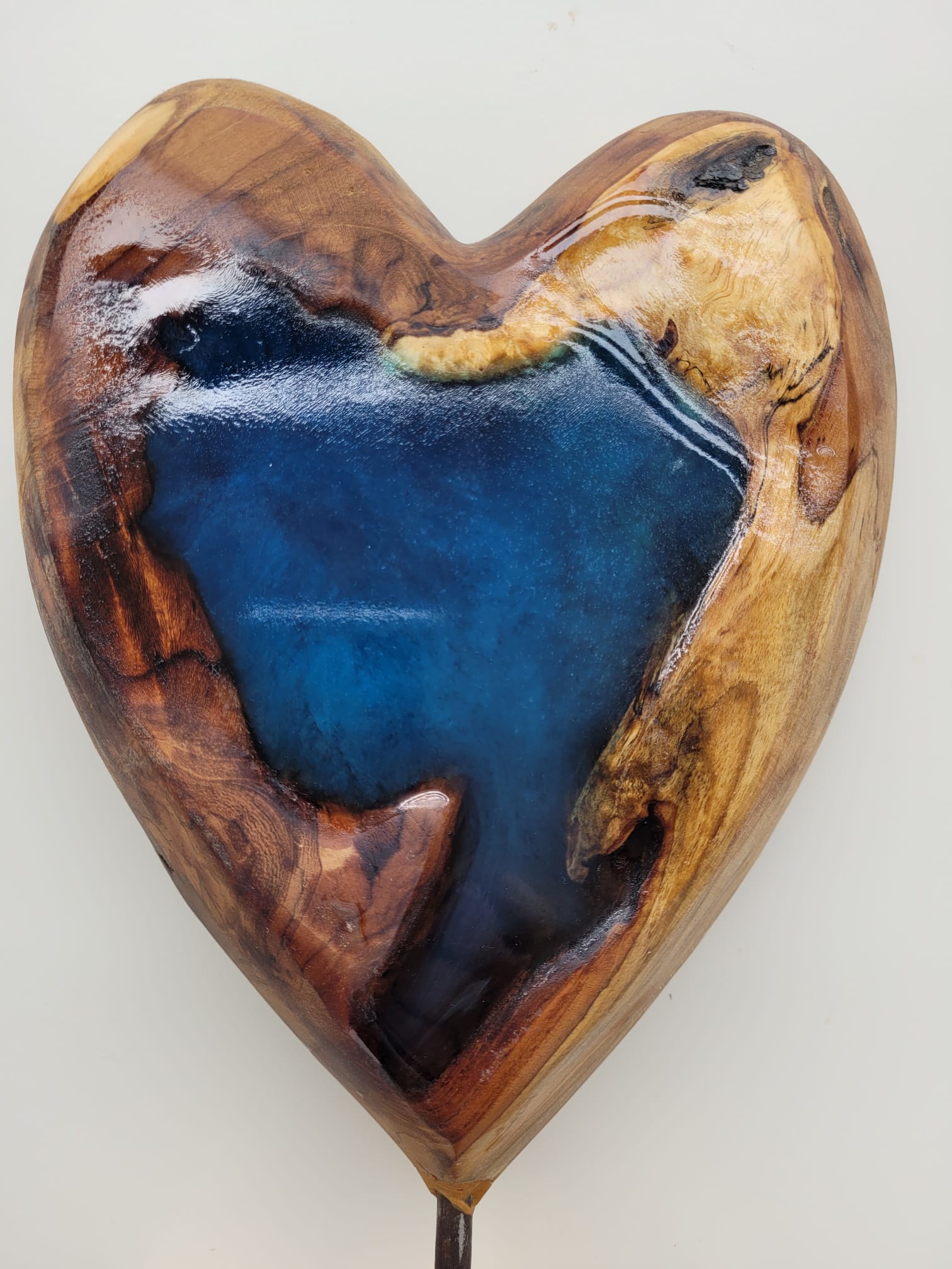 Ručně vyrobená dekorace srdce - teakové dřevo v kombinaci s modrou pryskyřicí.
