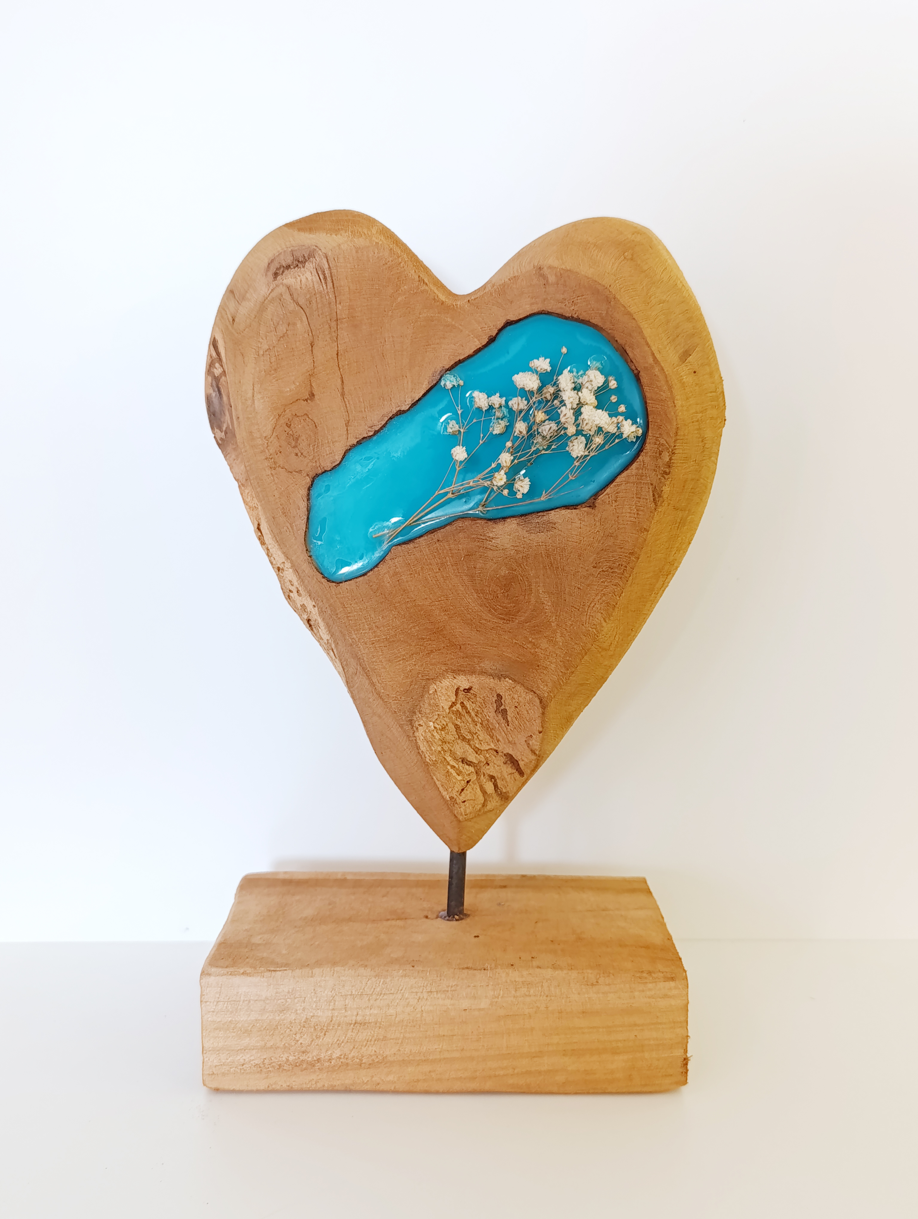 • Ručně vyrobená dekorace srdce - teakové dřevo v kombinaci s tyrkysovou pryskyřicí.