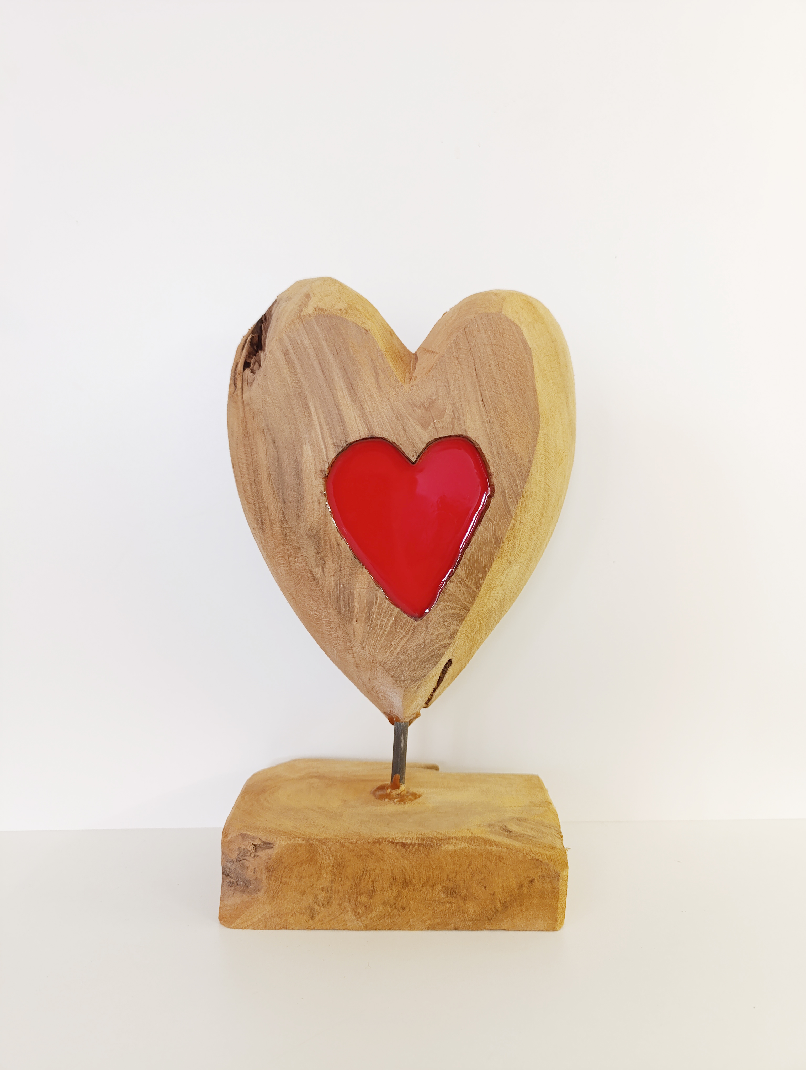 • Ručně vyrobená dekorace srdce - teakové dřevo v kombinaci s červenou pryskyřicí.