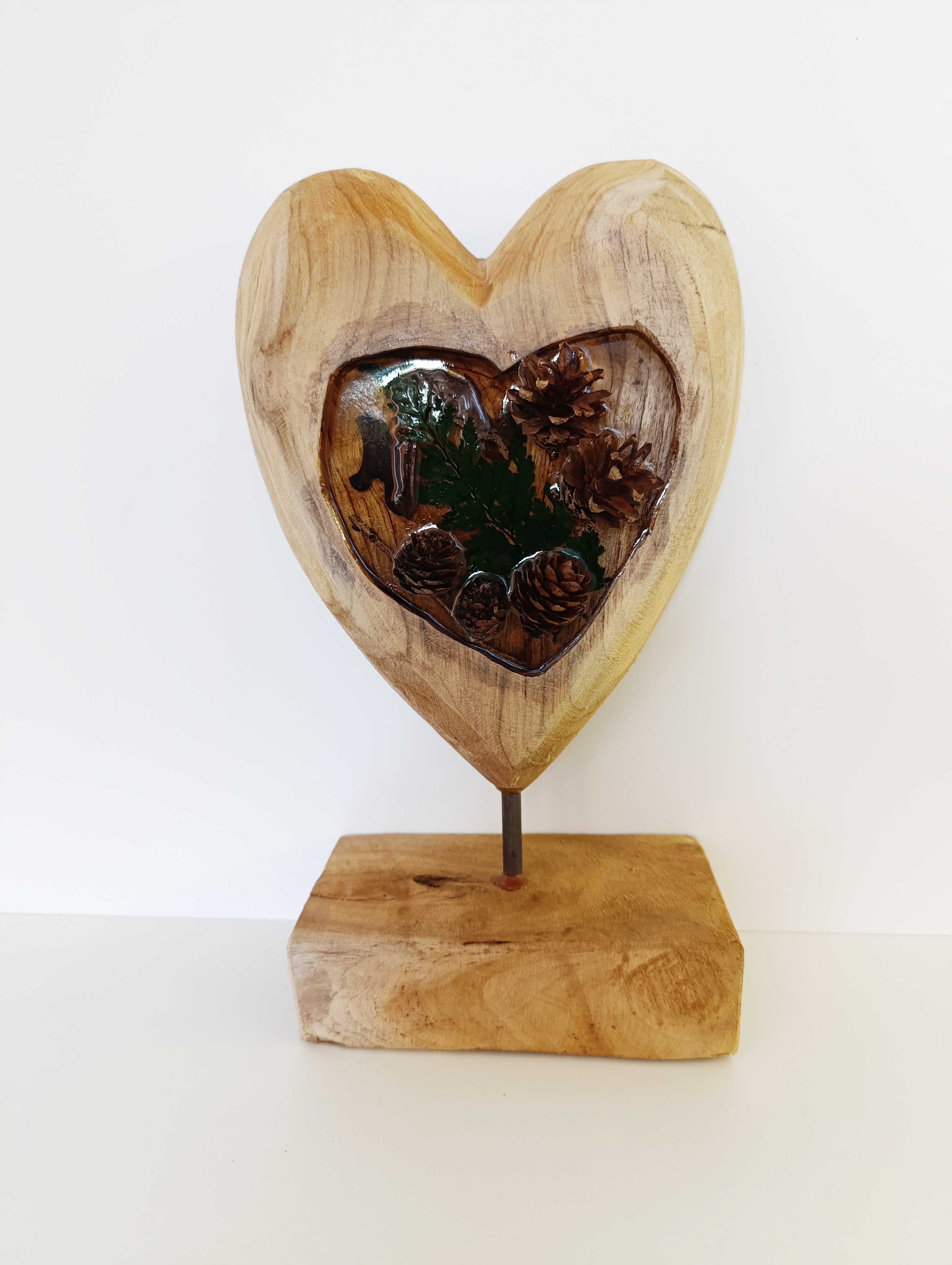 • Ručně vyrobená dekorace srdce - teakové dřevo v kombinaci s transparentní pryskyřicí.