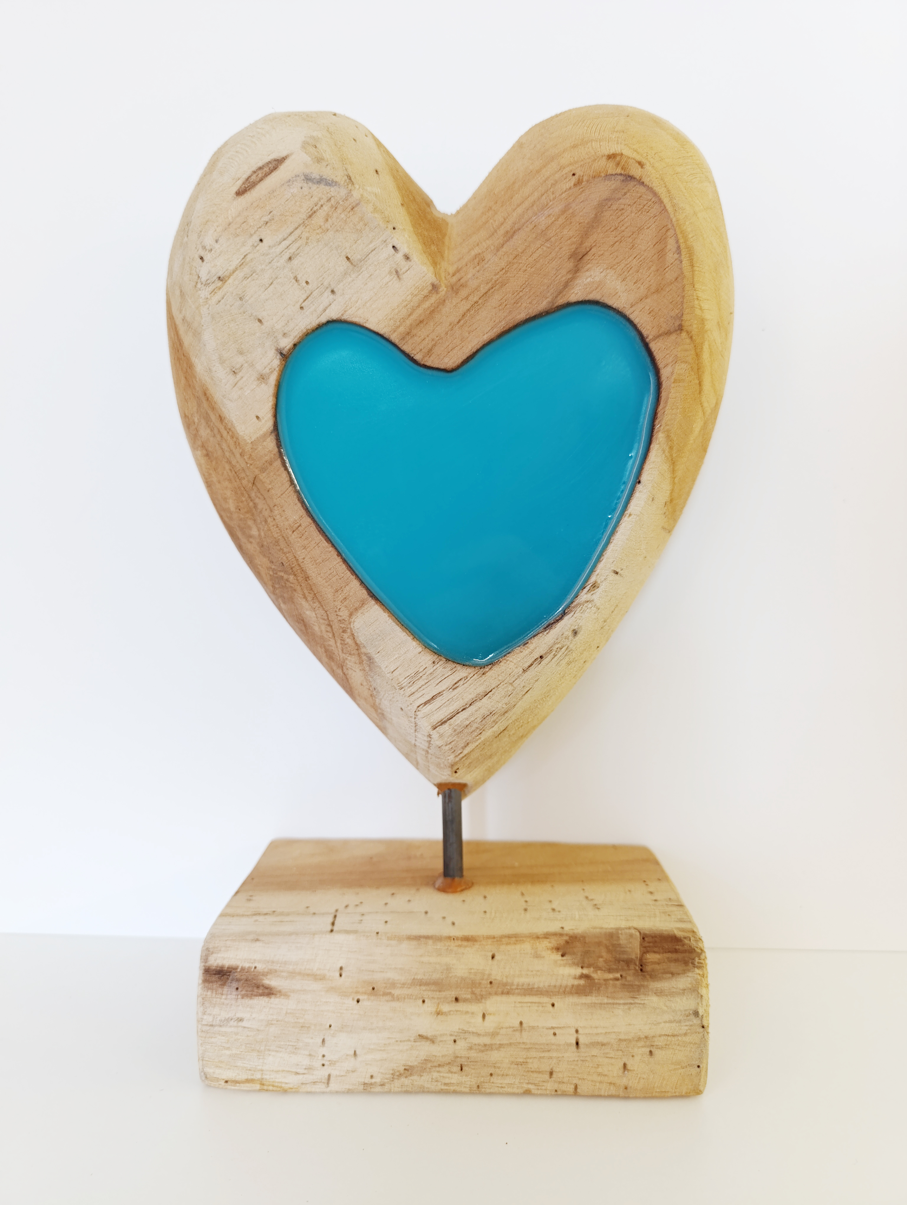 • Ručně vyrobená dekorace srdce - teakové dřevo v kombinaci s tyrkysovou pryskyřicí.