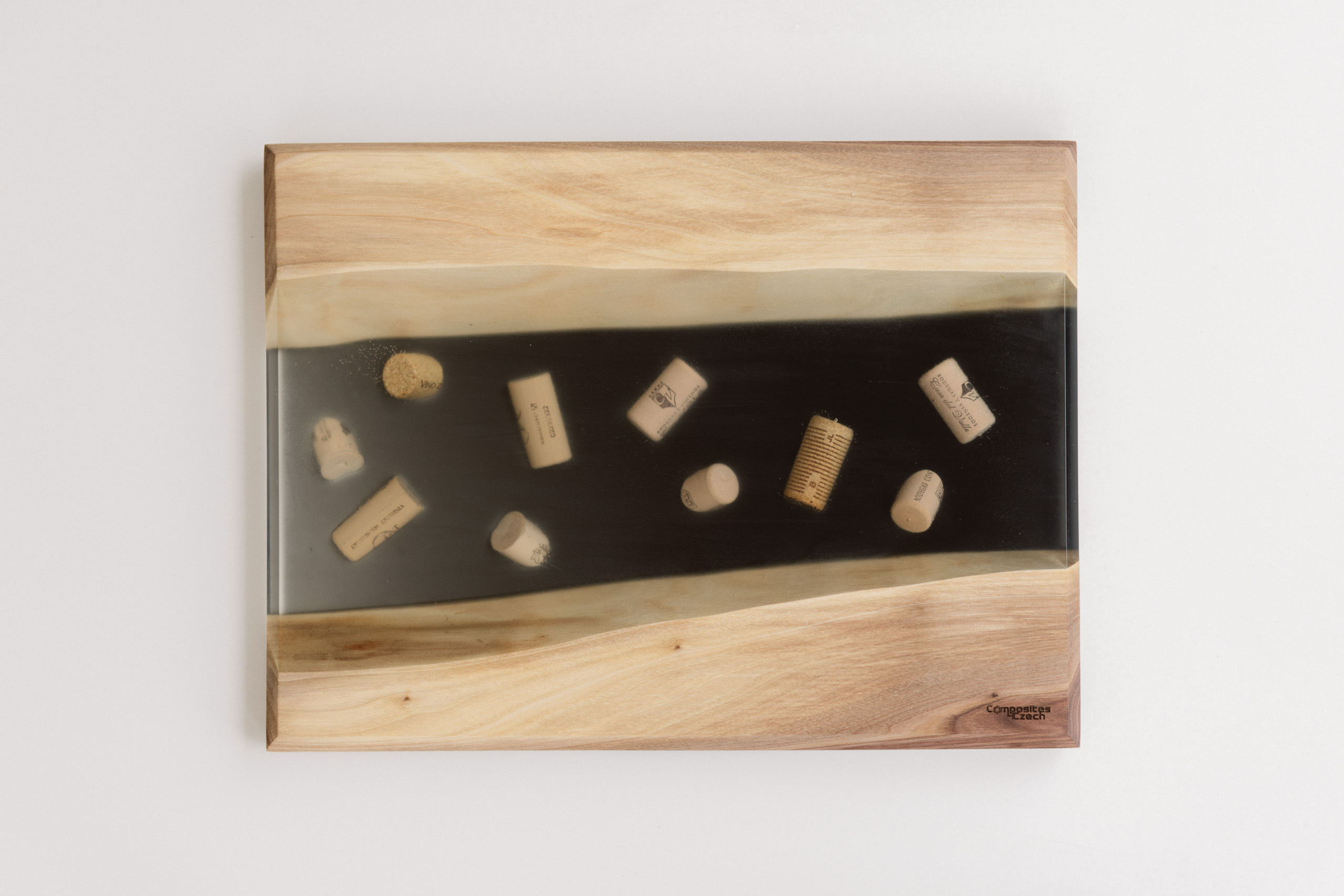 - Je dekorované korkovými uzávěry a černou pryskyřicí.