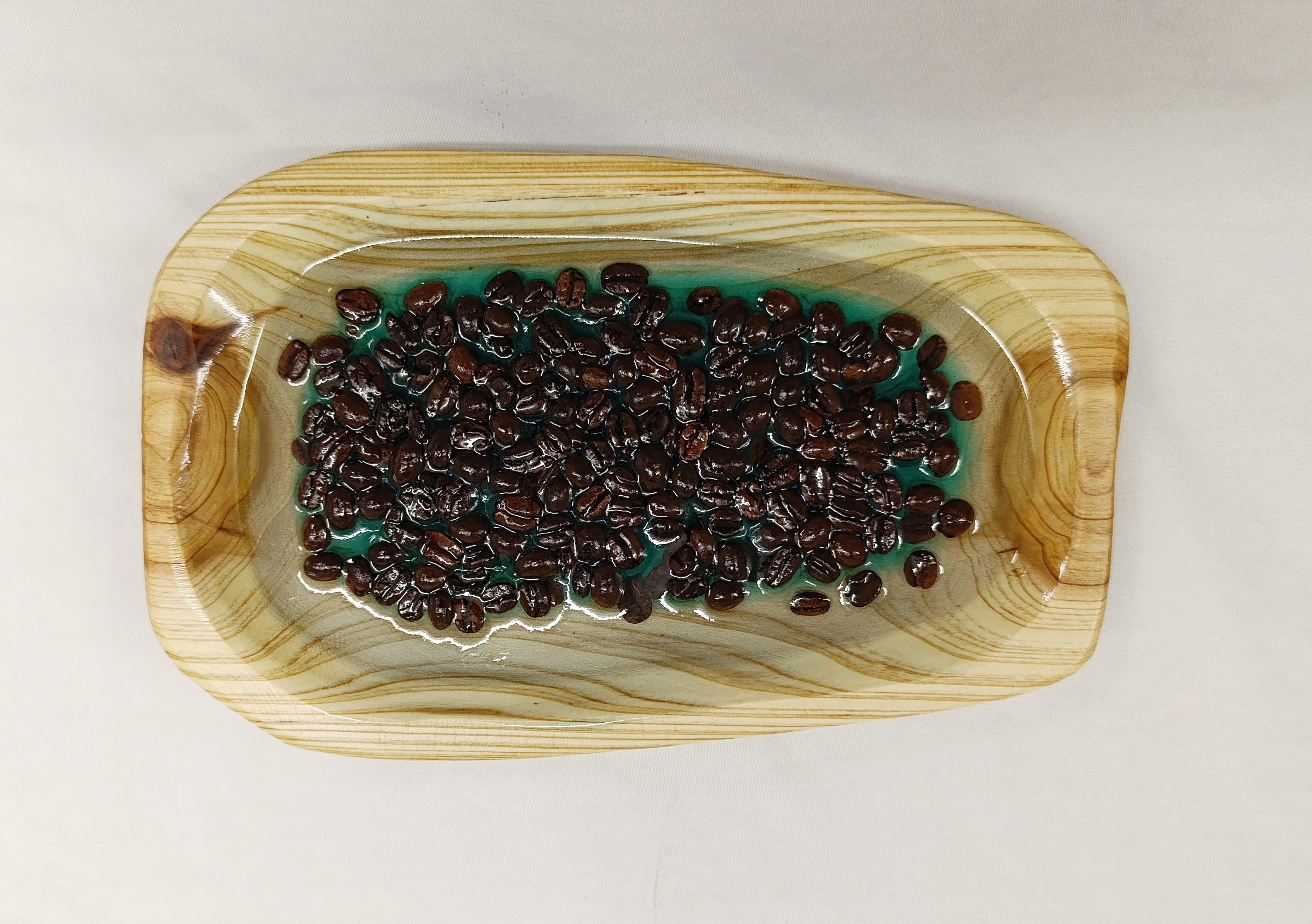 Miska z teakového dřeva dekorovaná transparentní smaragdovou pryskyřicí.