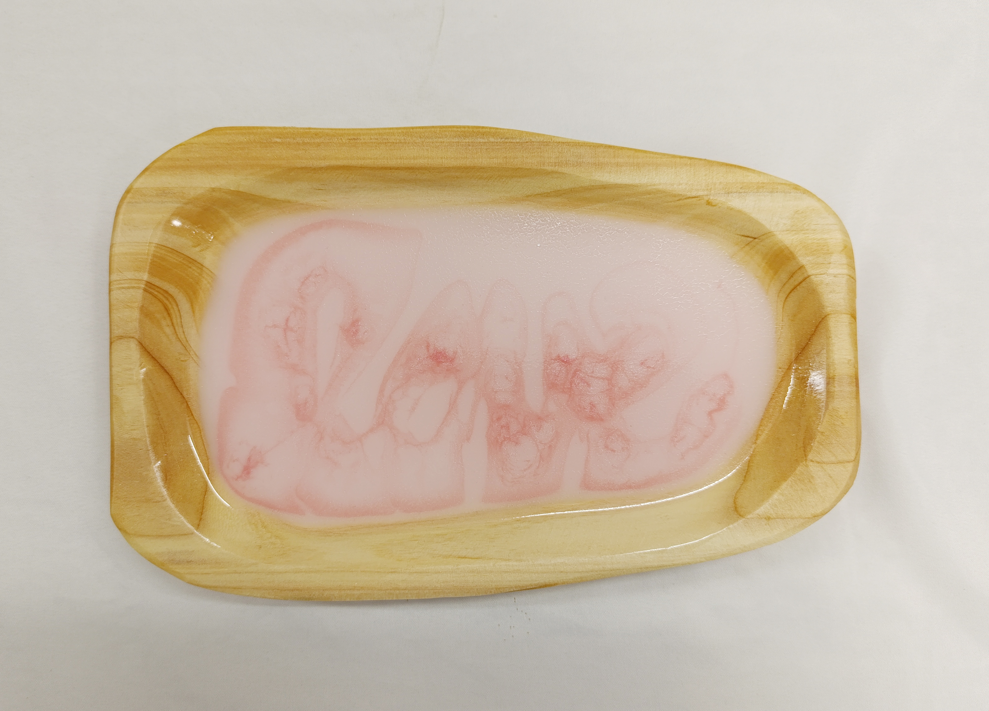 Miska z teakového dřeva dekorovaná růžovou pryskyřicí.