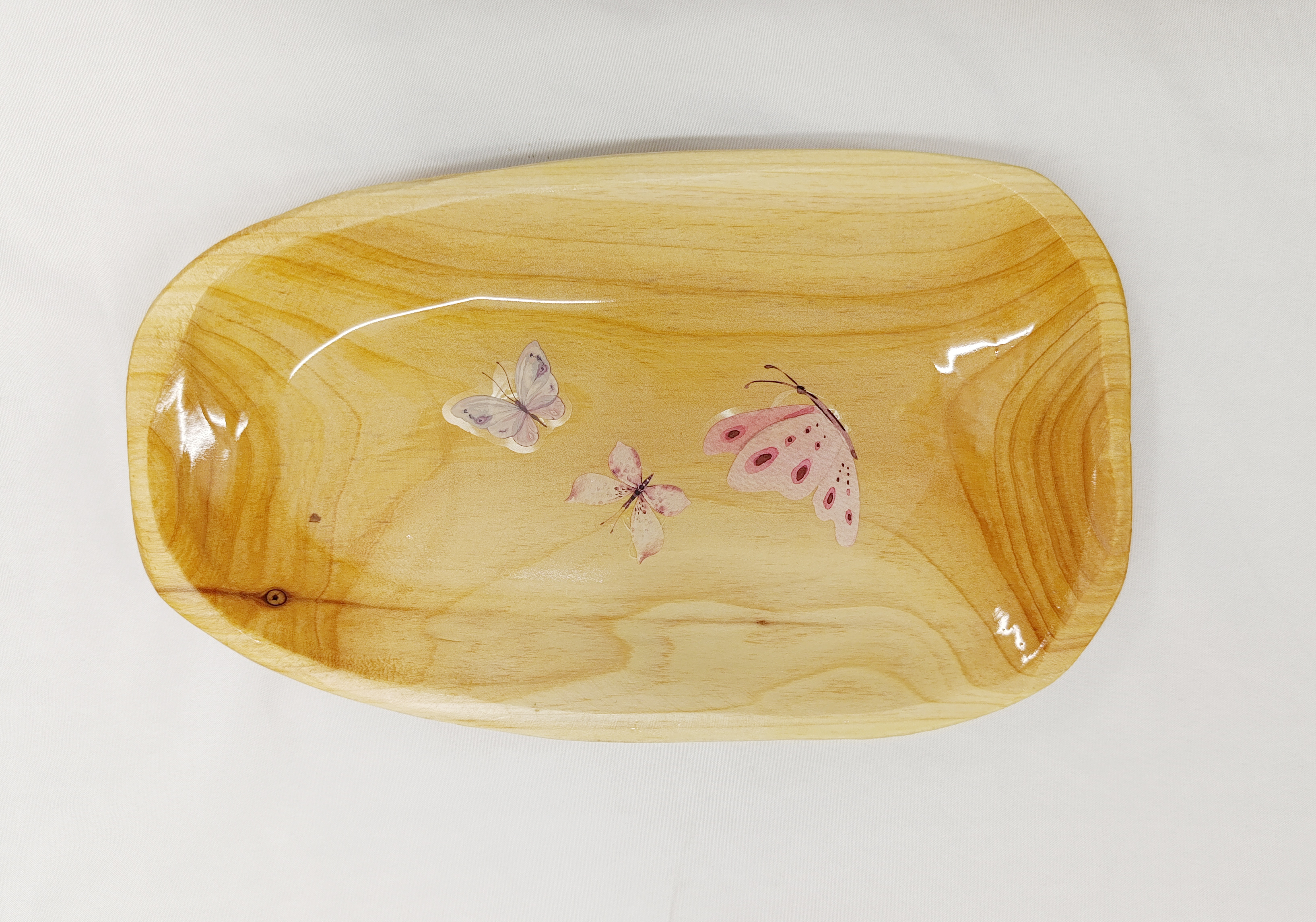 Miska z teakového dřeva dekorovaná transparentní pryskyřicí.
