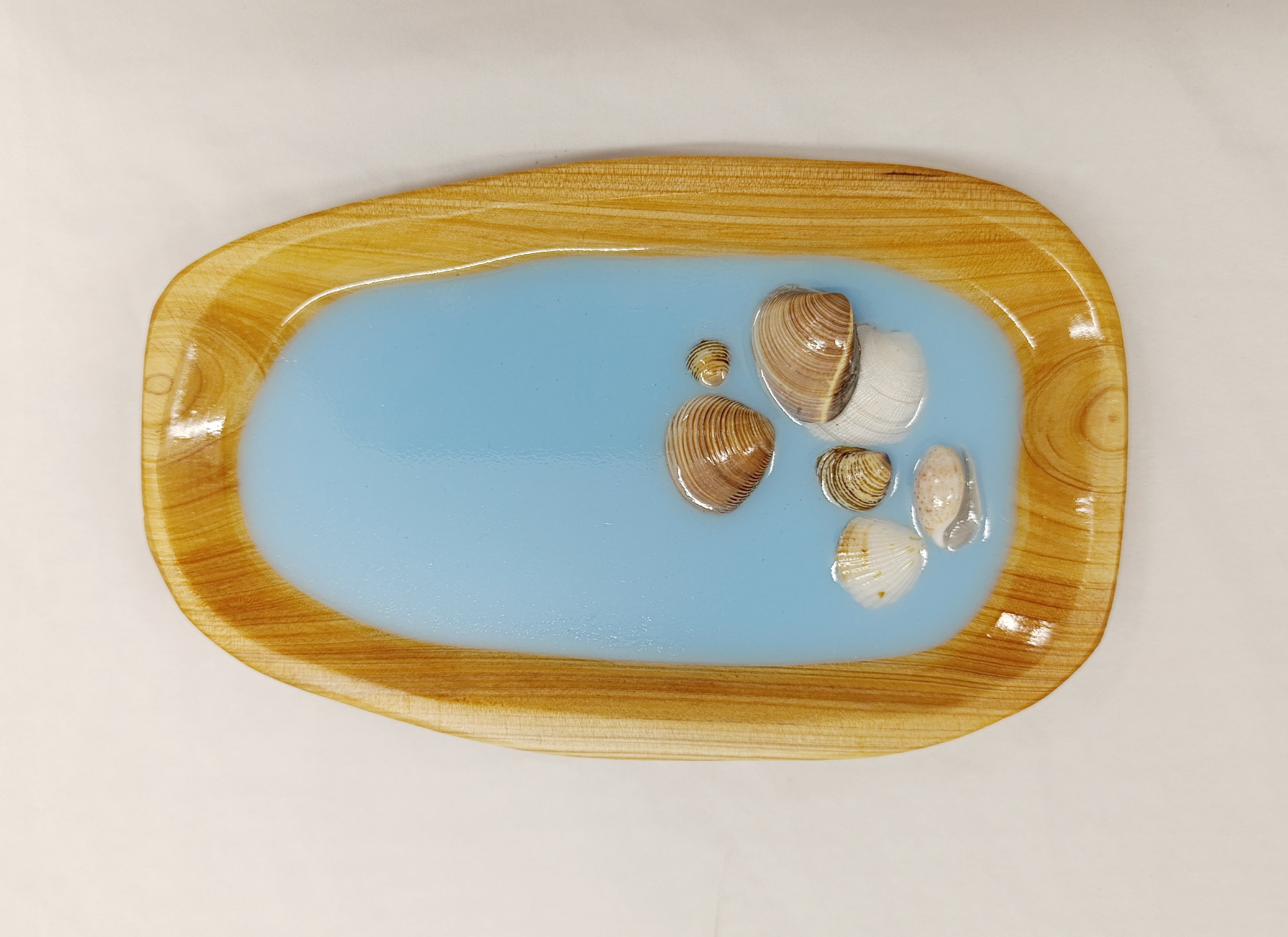 Miska z teakového dřeva dekorovaná modrou pryskyřicí.