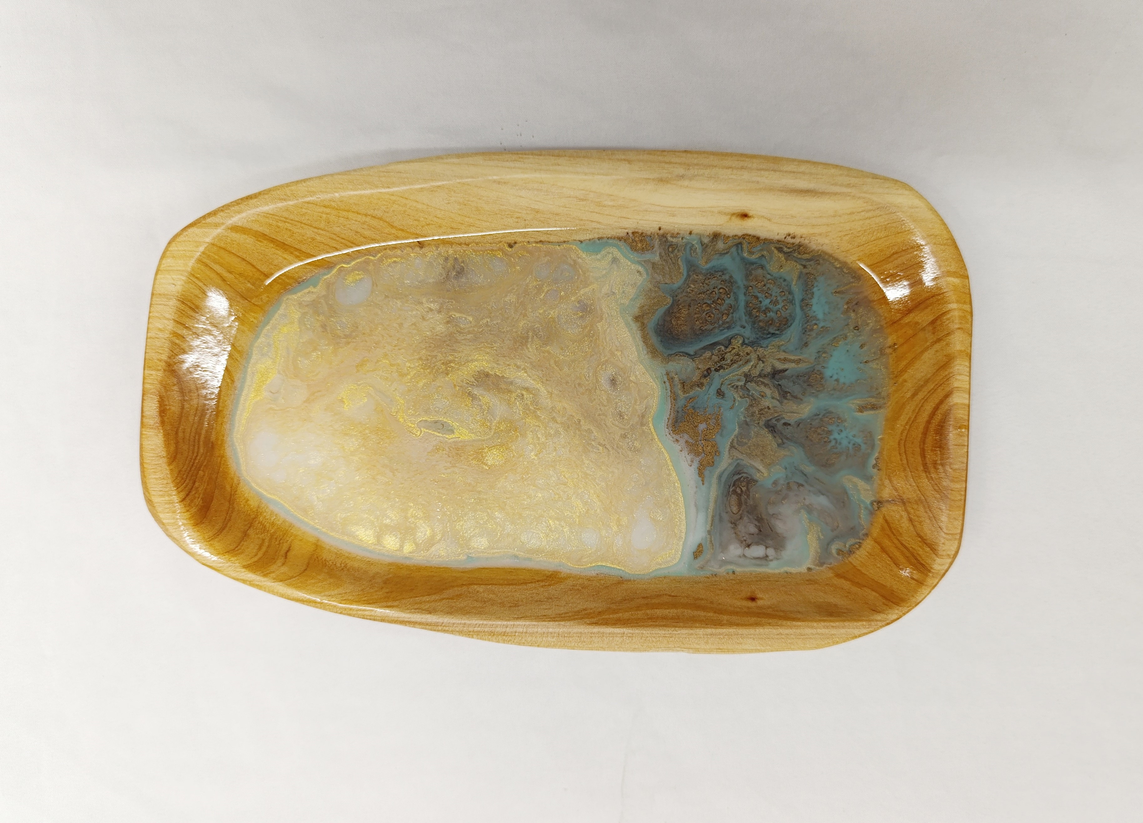 Miska z teakového dřeva dekorovaná bílou a tyrkysovou pryskyřicí.