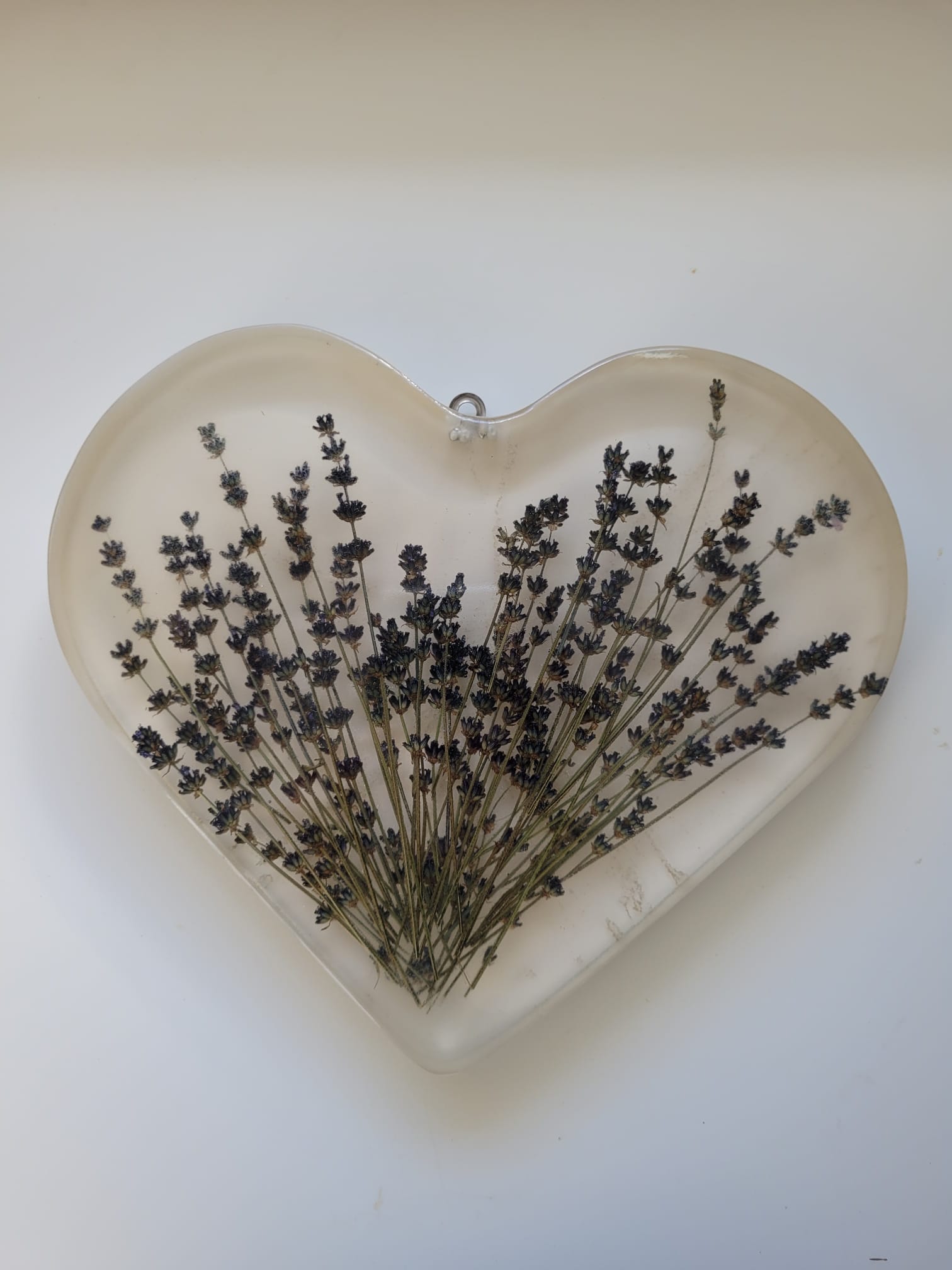 Ručně vyrobená dekorace srdce - Levandule v čiré pryskyřici s bílým podkladem.