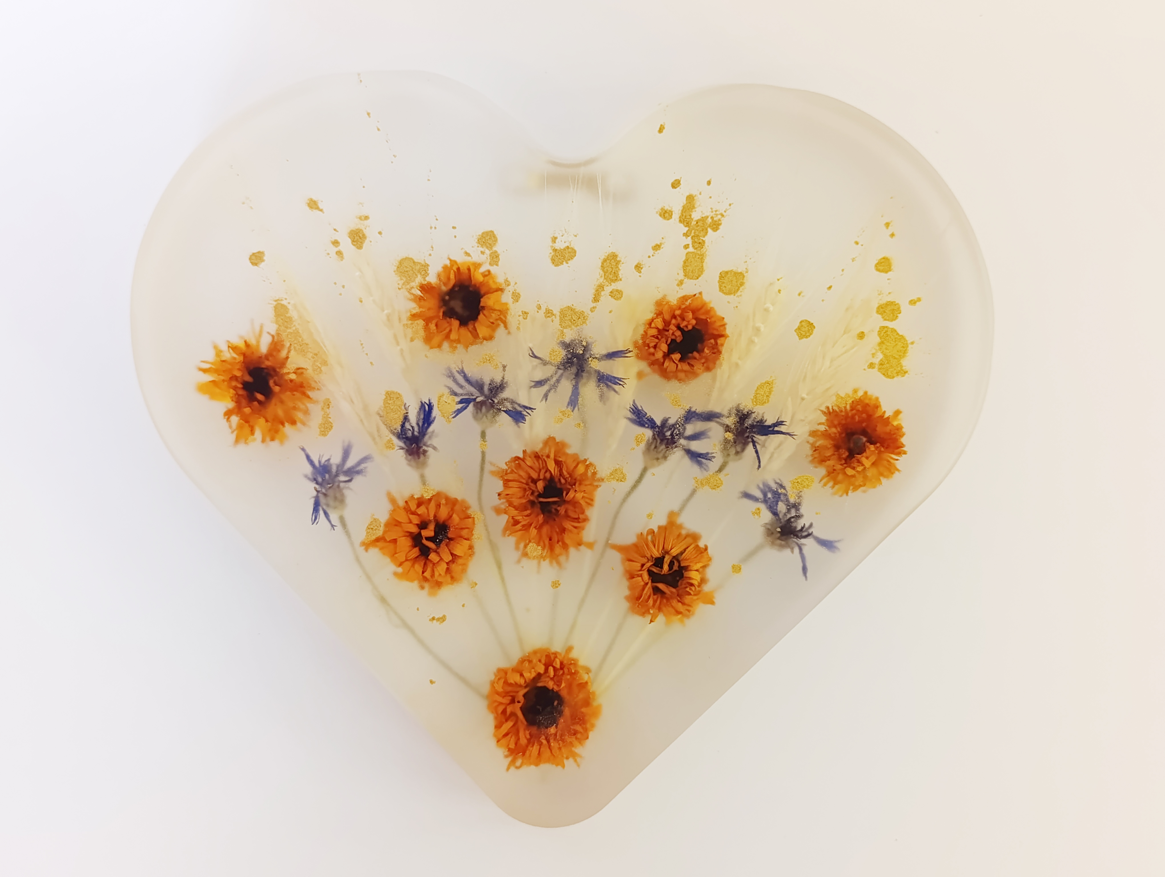 - Ručně vyrobená dekorace srdce - Květy v kombinaci s bílou a transparentní pryskyřicí.