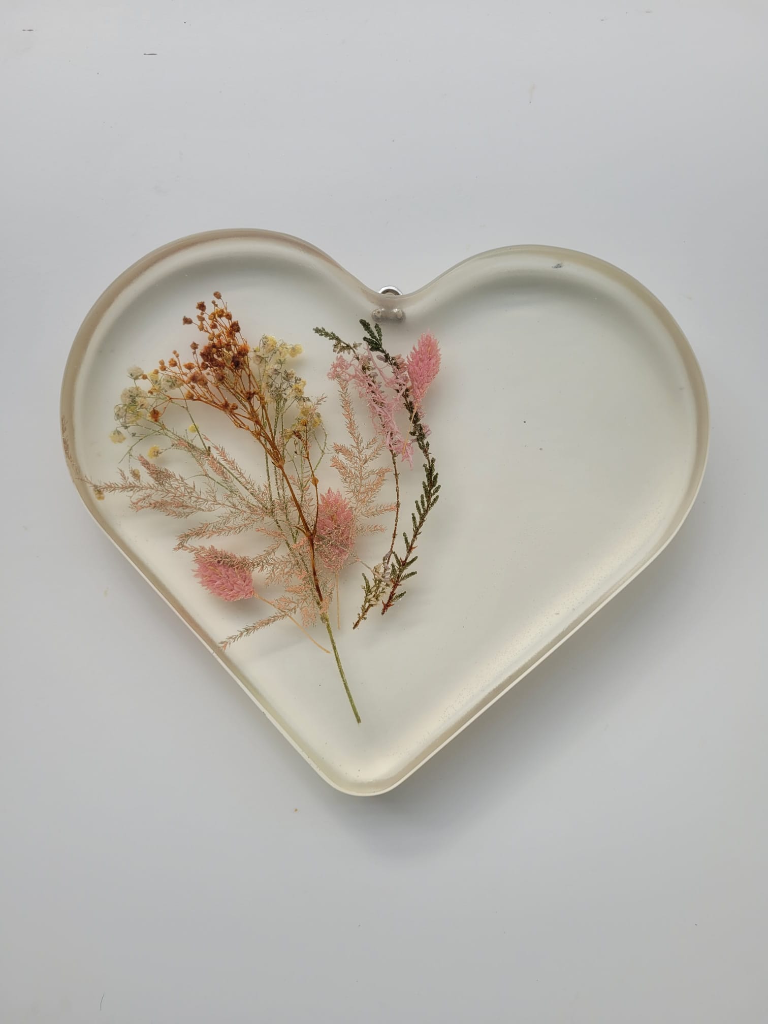 Ručně vyrobená dekorace srdce - růžové květy v kombinaci s transparentní pryskyřicí.
