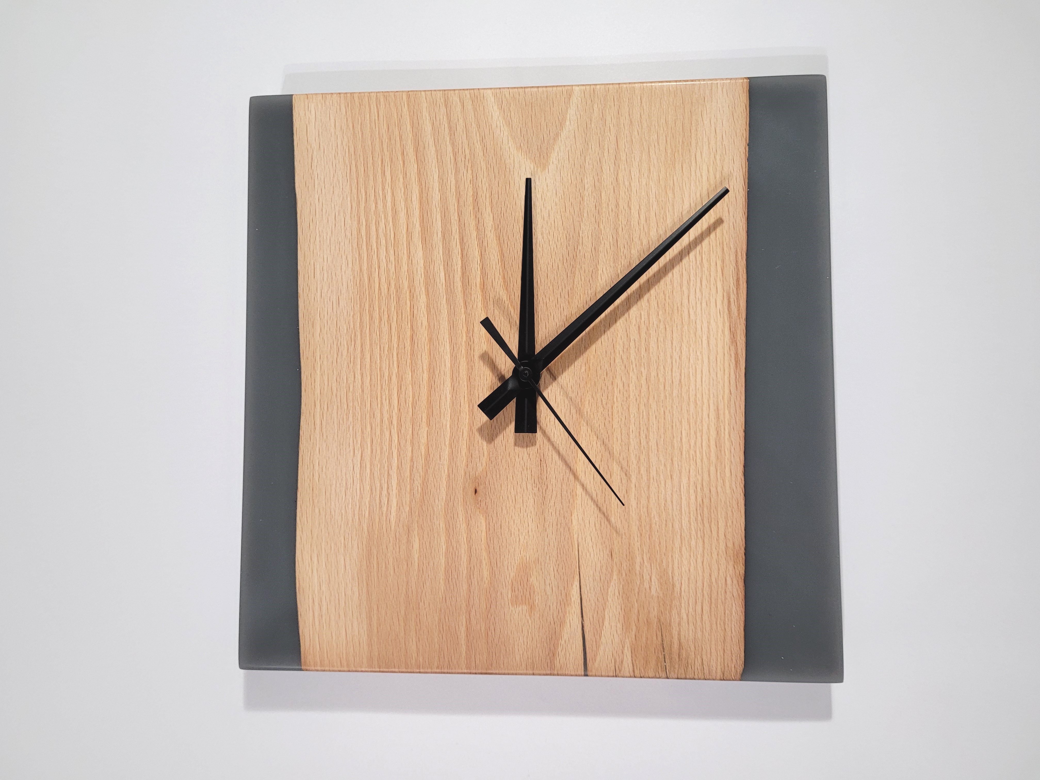 Ručně vyráběné hodiny z bukového dřeva a různých odstínů epoxidové pryskyřice.