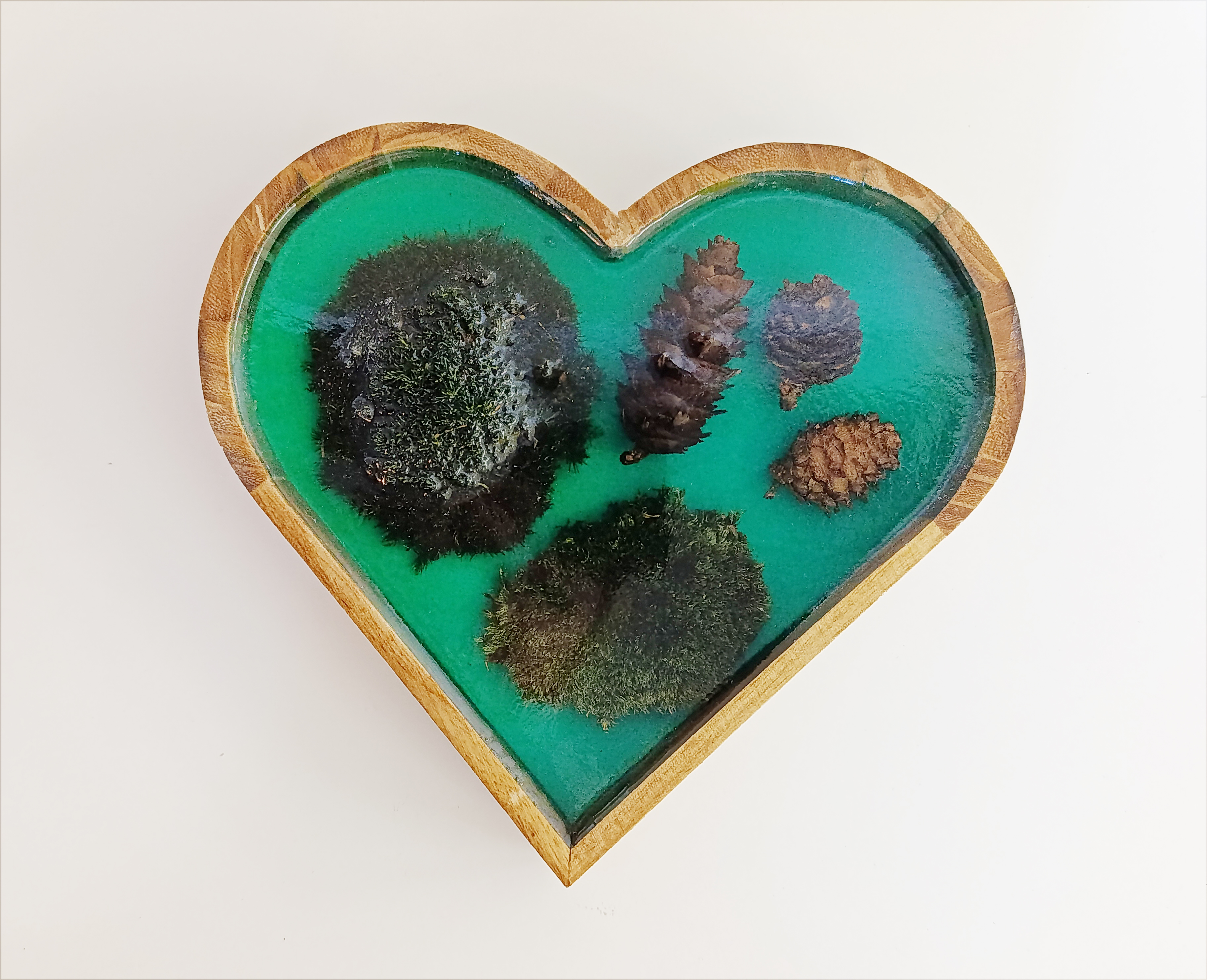 - Ručně vyrobená dekorace srdce - Mech a šišky v kombinaci s lahvově zelenou pryskyřicí.