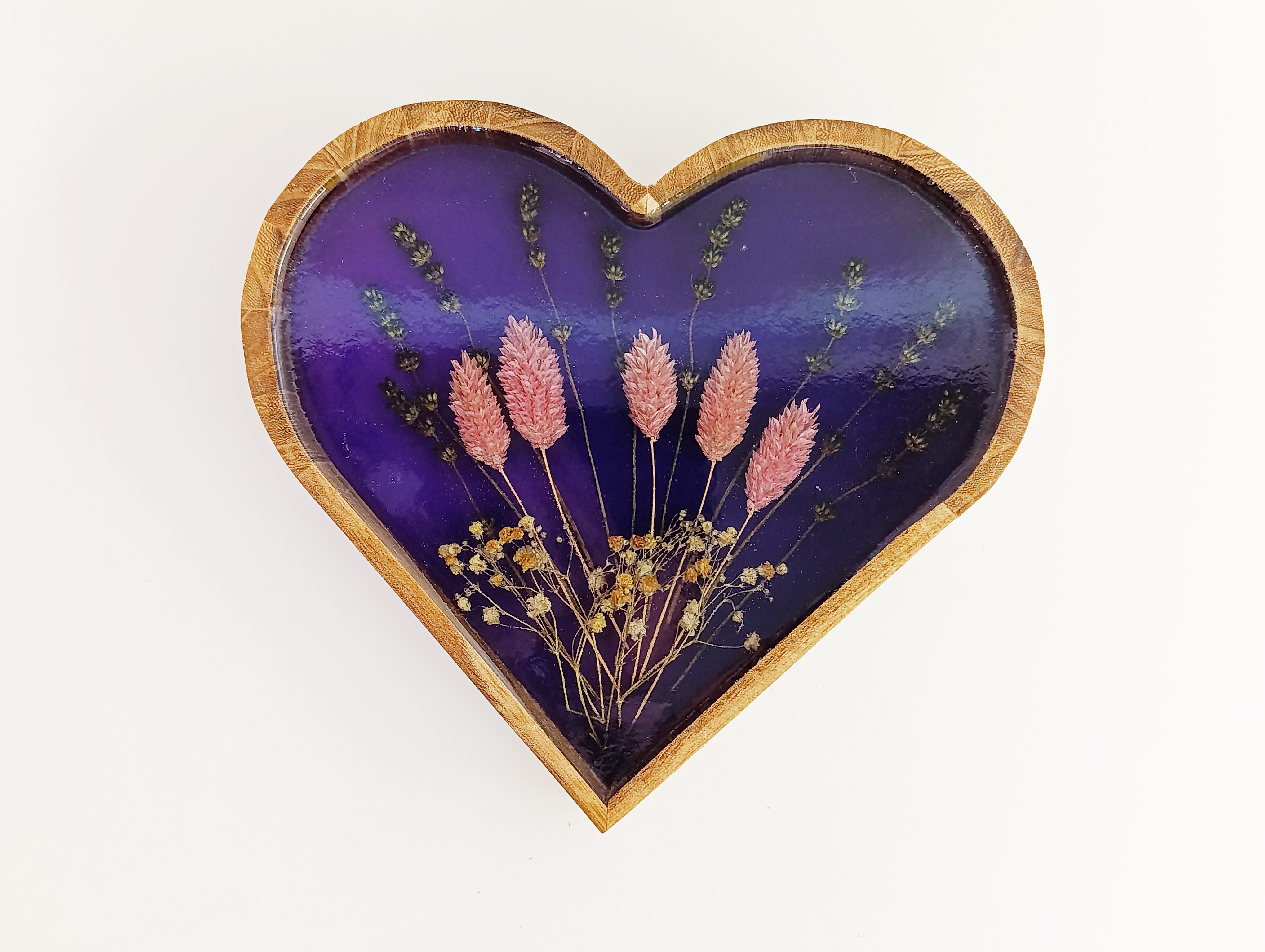 - Ručně vyrobená dekorace srdce - Sušené květiny v kombinaci s fialovou pryskyřicí.