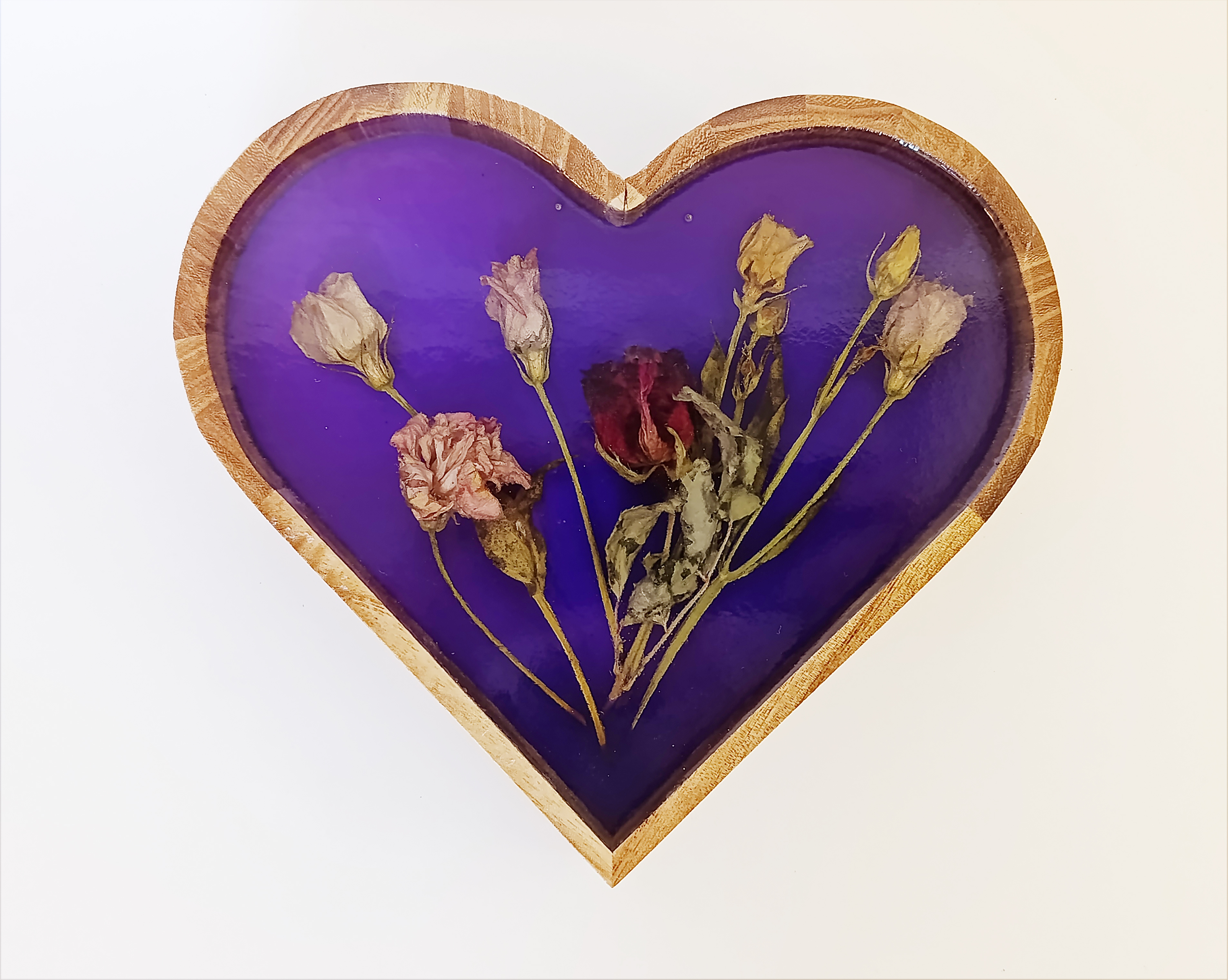 - Ručně vyrobená dekorace srdce - Sušené květiny v kombinaci s fialovou pryskyřicí.