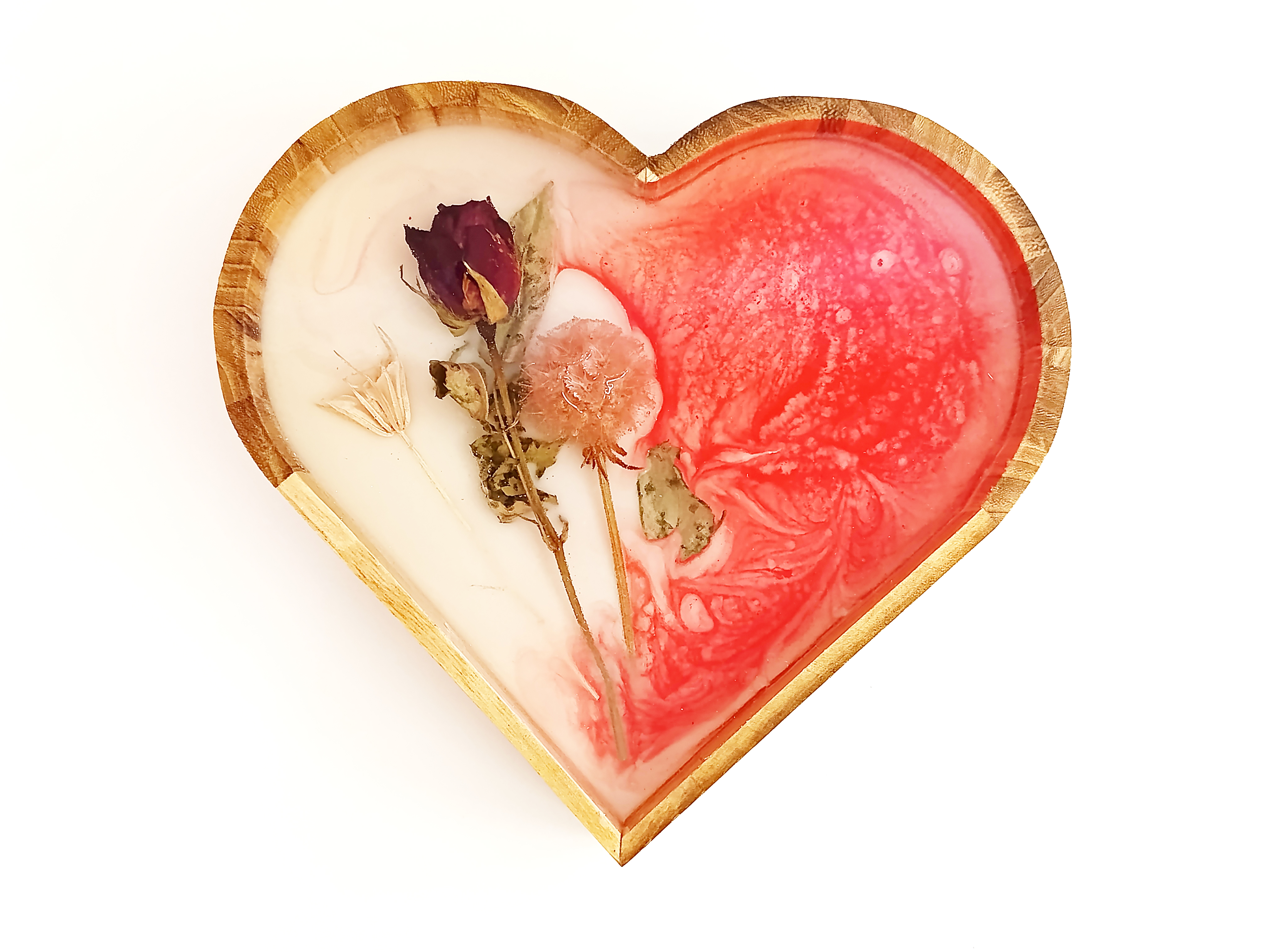 - Ručně vyrobená dekorace srdce - Sušené květiny v kombinaci s bílou a červenou pryskyřicí.