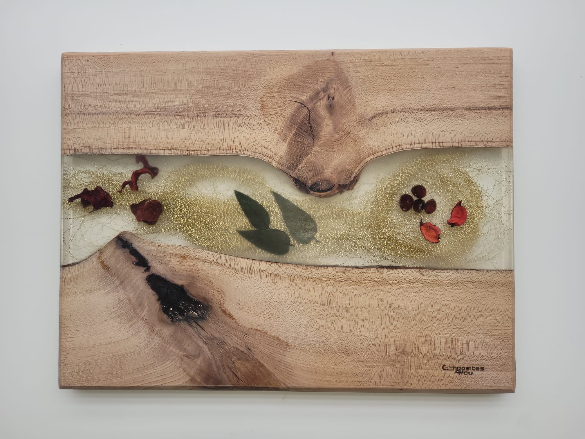 - Ručně vyráběné servírovací prkénko z jilmového dřeva o rozměrech 40 x 30 cm.
